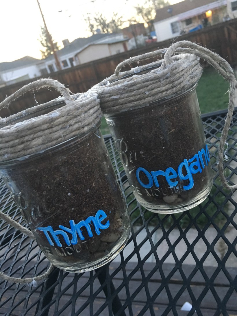 Then I took a sharpie (blue was all I had) and wrote the names of the herbs I was planting on the jars.