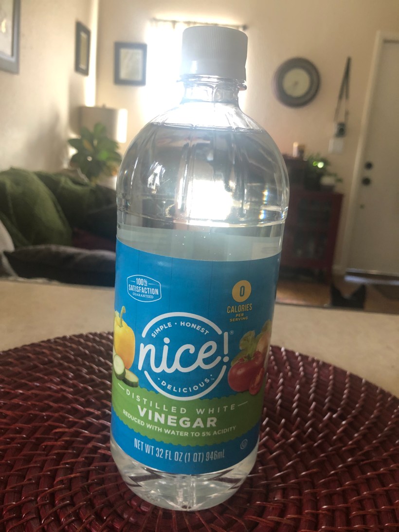 To make: to a spray bottle add 1 cup white vinegar, 15 drops lemon essential oil, and 15 drops melaleuca essential oil.